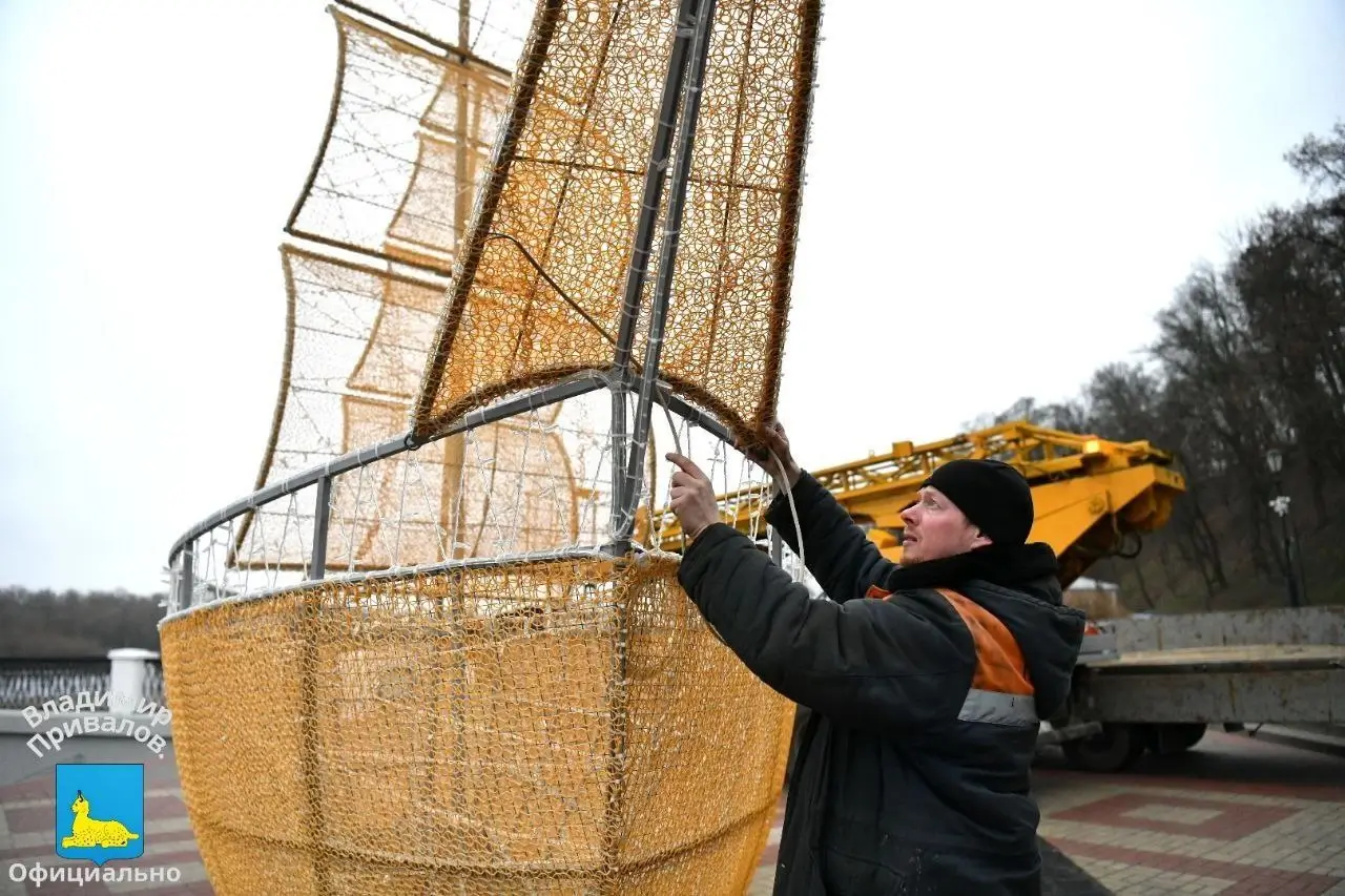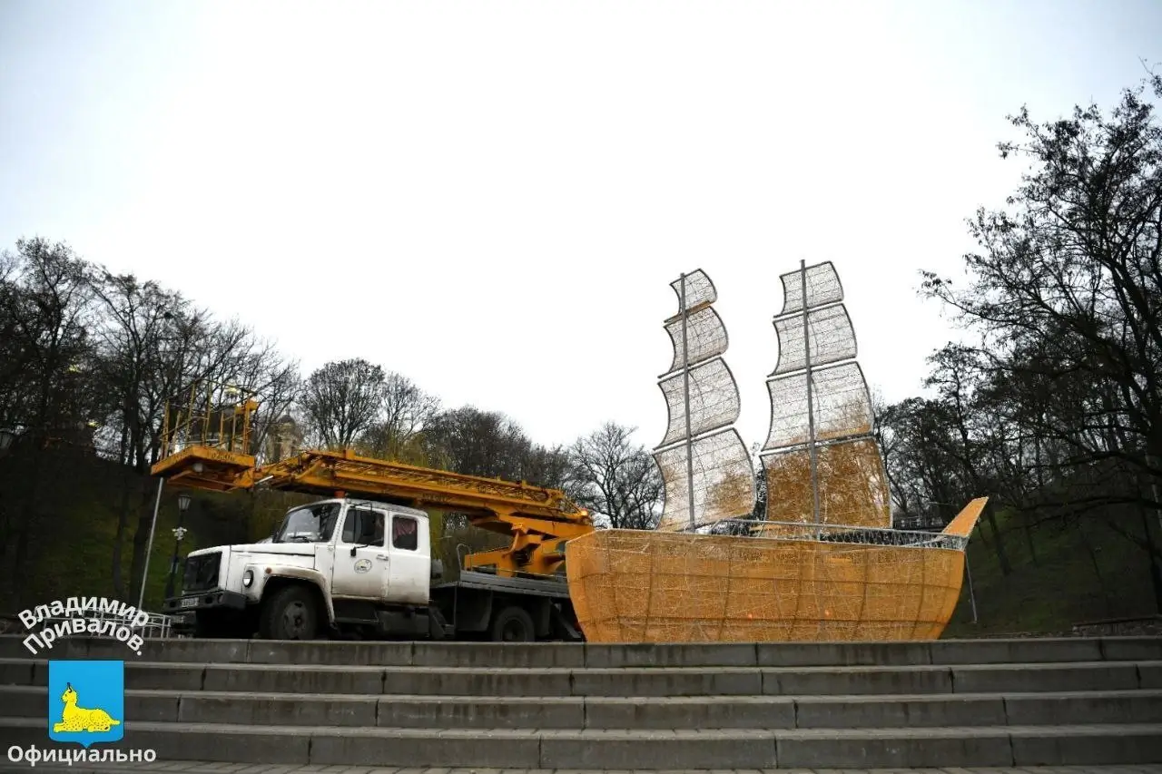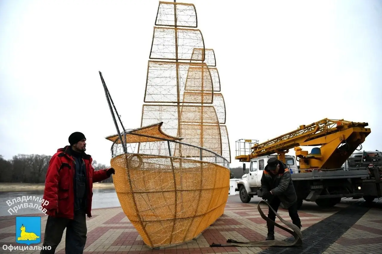 Монтаж завершен полностью: мастера закрепили элементы корпуса, расставили опоры и подготовили систему подсветки. В светлое время суток парусник воспринимается как декоративный элемент городской среды, однако основная часть визуального эффекта раскрывается вечером. С наступлением сумерек на конструкции включается праздничная иллюминация, создающая яркий акцент на фоне набережной.